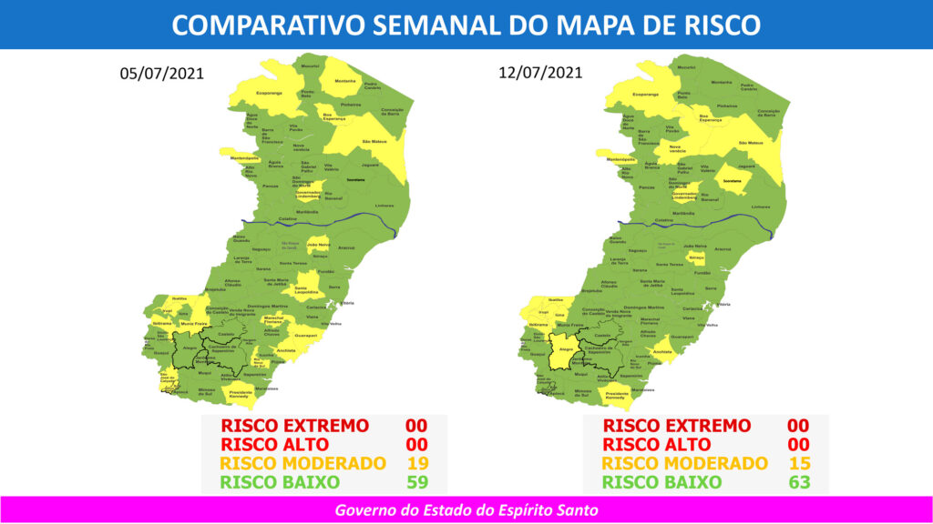Anunciado na sexta-feira (9/07) e vigente desde essa segunda-feira (12/07), o 63º Mapa de Risco Covid-19 tem 63 dos 78 municípios capixabas classificados em Risco Baixo e 15 em Risco Moderado. Não há municípios classificados em Risco Alto.