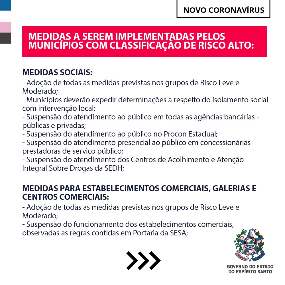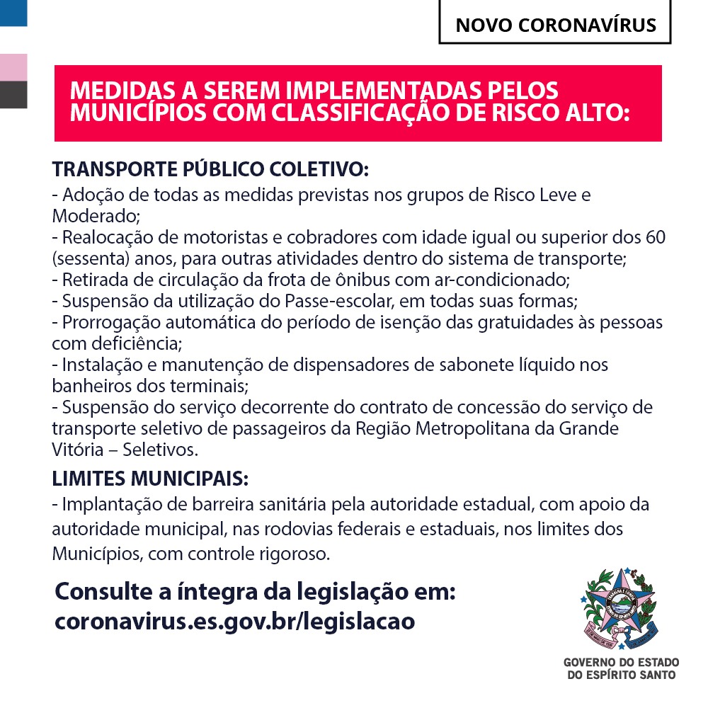 Para ter acesso à classificação dos municípios no mapa de risco, assim como as medidas, acesse o site especial sobre o Coronavírus (http://coronavirus.es.gov.br) ou leia a íntegra da legislação em: http://coronavirus.es.gov.br/legislacao.