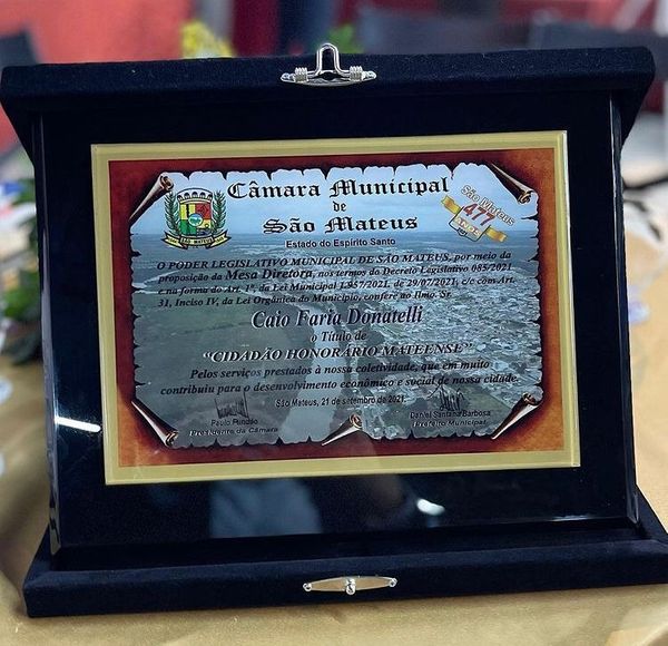 O presidente da Câmara de São Mateus, Paulo Fundão (PP), e o vice-presidente Kacio Mendes (PSDB), foram os autores, em nome da Mesa Diretora, da indicação para o empresário Caio Faria Donatelli ser homenageado pelo Legislativo. Na sessão solene sábado (25/09), marcada fartos pratos de picanha a gorgonzola e camarão VG, Donatelli recebeu o Título de Cidadão Honorário de São Mateus.