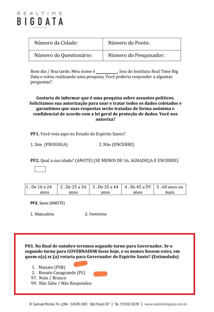 Até a publicação desta reportagem, o direção do instituto Real Time BigData ainda não havia se manifestado sobre o erro grave apresentado no formulário da pesquisa para governador do Espírito Santo. Havendo manifestação, o texto será atualizado.