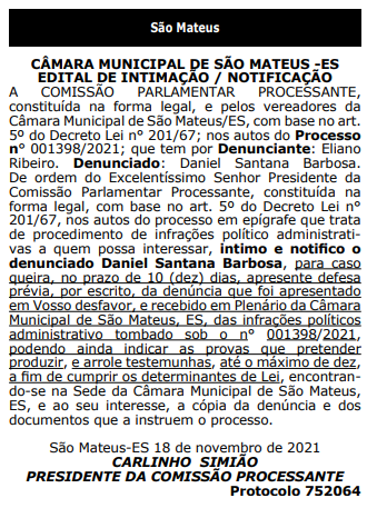 “Intimo e notifico o denunciado Daniel Santana Barbosa, para caso queira, no prazo de 10 (dez) dias, apresente defesa prévia, por escrito, da denúncia que foi apresentada em Vosso desfavor, e recebida em Plenário da Câmara Municipal de São Mateus-ES, das infrações político-administrativas tombada sob o nº 001398/2021, podendo ainda indicar as provas que pretender produzir, e arrole testemunhas, até o máximo de dez, a fim de cumprir os determinantes de lei”, destaca o Edital de Intimação e Notificação.