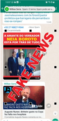 Ainda nesse sábado (15/01), poucas horas depois do ato de vandalismo contra o outdoor da manifestação pública Carreata da Justiça, membros da milícia digital (gabinete do ódio) que trabalha para o prefeito Daniel Santana iniciou os ataques com montagens de fake news (notícias falsas) contra políticos e empresários de São Mateus, acusando-os de darem apoio aos organizadores do protesto da Comunidade Mateense. Os materiais seguem sendo compartilhados nas redes sociais e em grupos de WhatsApp neste domingo (16/01), por meio de perfis fakes da milícia digital.