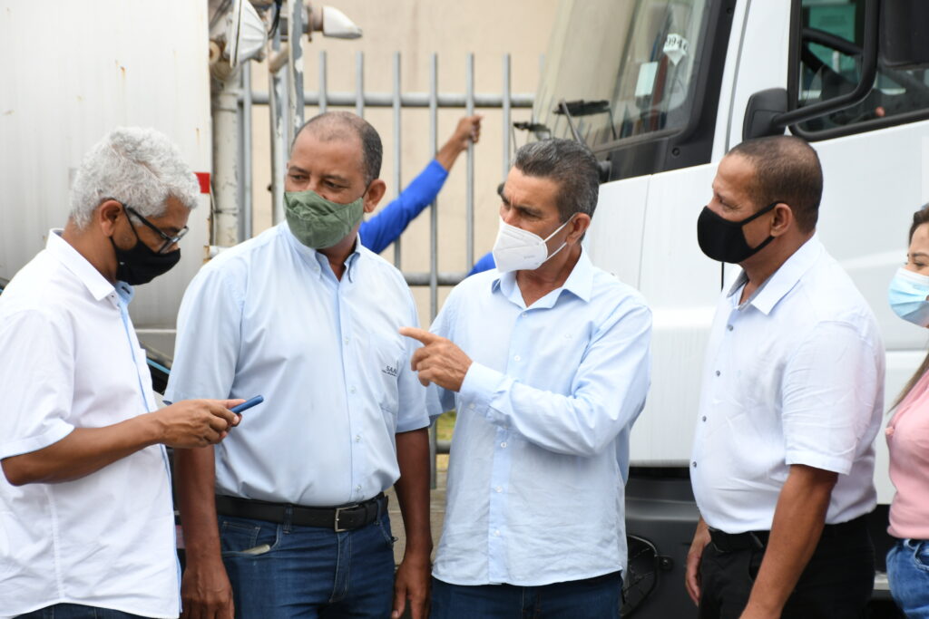 O prefeito em exercício Ailton Caffeu, os secretários Hassan Rezende (Defesa Social) e Francisco Botelho Neto (Governo), e os vereadores Carlinhos Simião, Delermano Suim e Gilton Gomes, o Pia, acompanharam de perto a saída dos primeiros veículos já carregados para suprir a falta d’água que vem ocorrendo há anos em várias localidades do interior mateense.